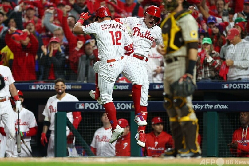 【10月22日 AFP】22MLBは21日、ナ・リーグ優勝決定シリーズ(7回戦制)第3戦が行われ、フィラデルフィア・フィリーズ(Philadelphia Phillies)はカイル・シュワバー(Kyle Schwarber)がまたしても一発を放つなどしてサンディエゴ・パドレス(San Diego Padres)を4-2で下し、2勝1敗とリードした。