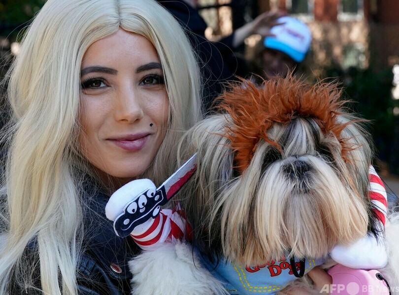 【10月23日 AFP】米ニューヨーク市で22日、毎年恒例の犬の仮装イベント「トンプキンススクエア・ハロウィーン・ドッグパレード(Tompkins Square Halloween Dog Parade)」が開催された。32回目となる今年も、思い思いの仮装で参加する飼い主と犬の姿が見られた。(c)AFP