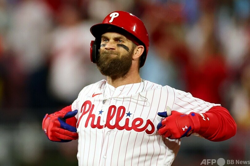 パドレスは5回にフアン・ソト(Juan Soto)が2点本塁打を放ったが、フィリーズはその裏にホスキンスの2点本塁打で同点に追いつくと、ハーパーの適時二塁打で勝ち越し。さらにカステラノスの安打でハーパーが本塁を踏んで8-6とすると、6回にはカイル・シュワバー(Kyle Schwarber)、7回にはJ.T.リアルミュート(J.T. Realmuto)にそれぞれ一発が飛び出した。(c)AFP