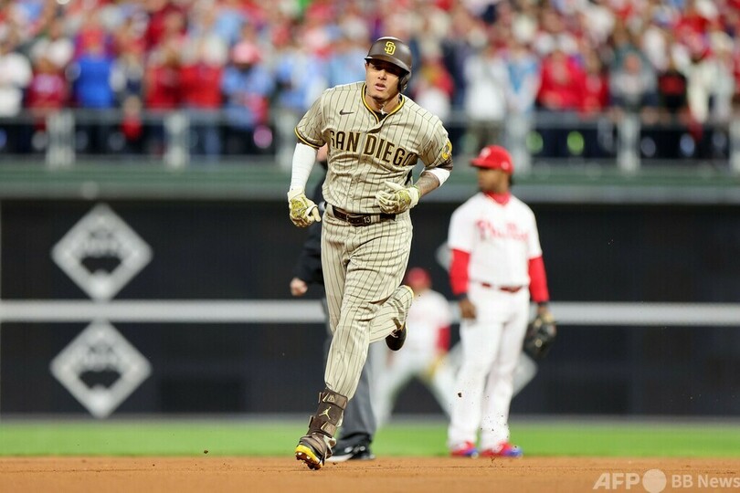 パドレスは5回にフアン・ソト(Juan Soto)が2点本塁打を放ったが、フィリーズはその裏にホスキンスの2点本塁打で同点に追いつくと、ハーパーの適時二塁打で勝ち越し。さらにカステラノスの安打でハーパーが本塁を踏んで8-6とすると、6回にはカイル・シュワバー(Kyle Schwarber)、7回にはJ.T.リアルミュート(J.T. Realmuto)にそれぞれ一発が飛び出した。(c)AFP
