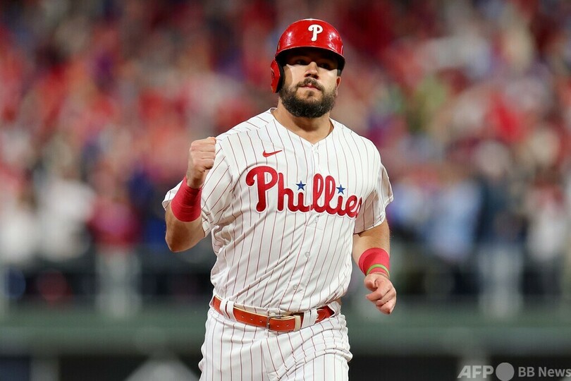パドレスは5回にフアン・ソト(Juan Soto)が2点本塁打を放ったが、フィリーズはその裏にホスキンスの2点本塁打で同点に追いつくと、ハーパーの適時二塁打で勝ち越し。さらにカステラノスの安打でハーパーが本塁を踏んで8-6とすると、6回にはカイル・シュワバー(Kyle Schwarber)、7回にはJ.T.リアルミュート(J.T. Realmuto)にそれぞれ一発が飛び出した。(c)AFP