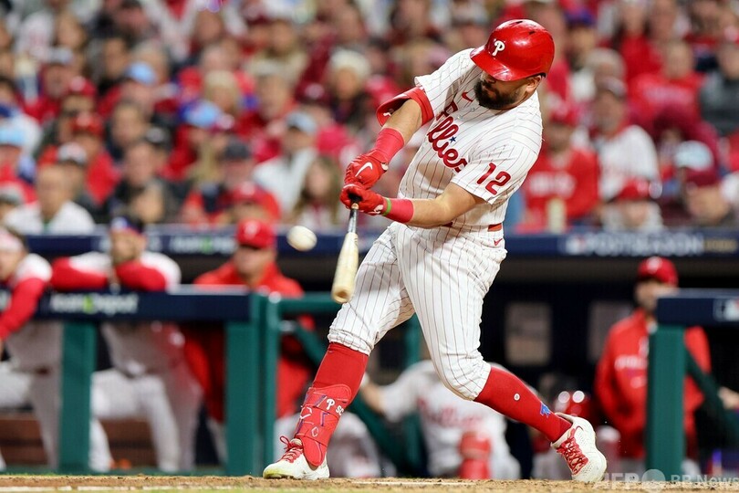 するとその裏にホスキンスの2点本塁打とブライス・ハーパー(Bryce Harper)の適時二塁打で1点差としたフィリーズは、4回に二塁打で出塁したニック・カステラノス(Nick Castellanos)がブライアン・ストット(Bryson Stott)の安打で生還して追いついた。