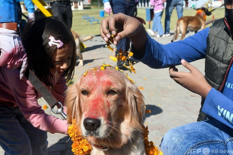警察犬も祝福、ヒンズー教の祭り「ティハール」 ネパール