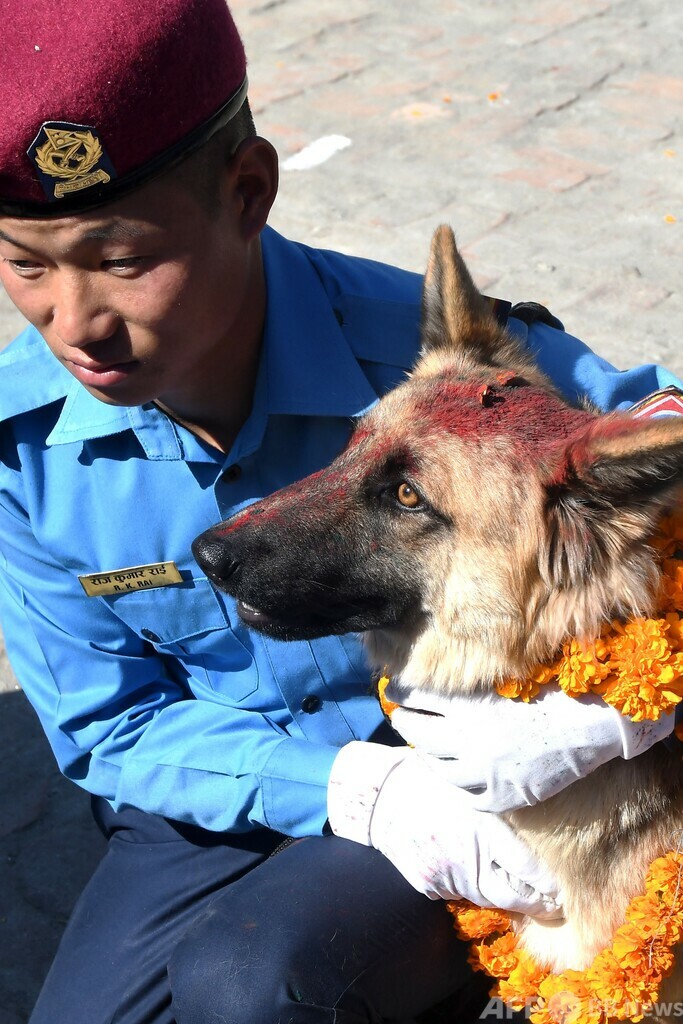 警察犬も祝福、ヒンズー教の祭り「ティハール」 ネパール