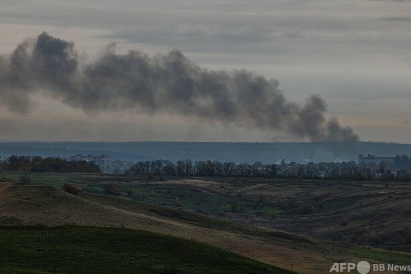 ロシア軍はドンバス地方に位置するドネツク(Donetsk)州バフムート(Bakhmut)を砲撃し、同市を守るウクライナ軍と激戦を繰り広げている。AFP記者は25日、戦地から立ち上る煙を目撃。同州のパウロ・キリレンコ(Pavlo Kyrylenko)知事によると、前日には民間人7人が死亡、3人が負傷した。(c)AFP
