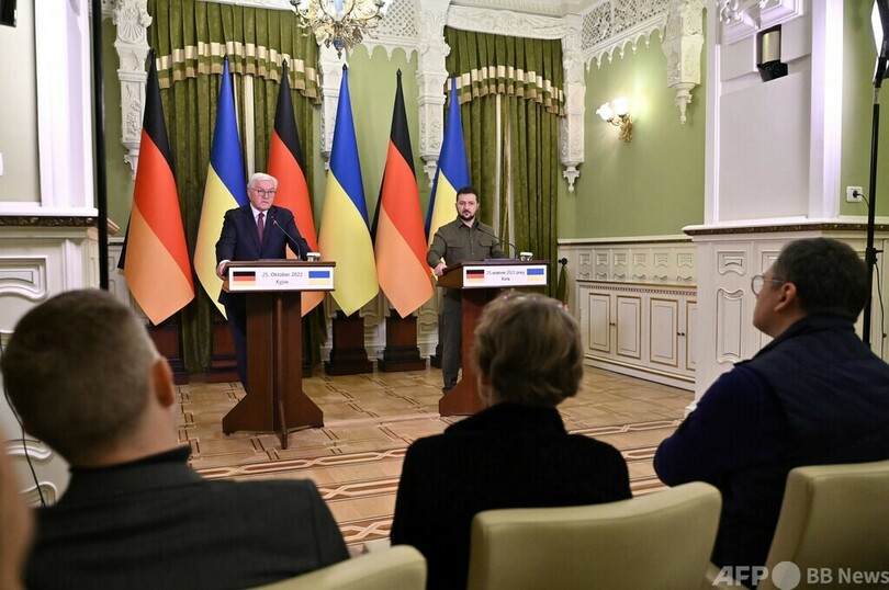 【10月26日 AFP】ドイツのフランクワルター・シュタインマイヤー(Frank-Walter Steinmeier)大統領は25日、ロシアによる軍事侵攻が始まって以来初めてウクライナを訪問した。その際、空襲警報が鳴り防空壕(ごう)への避難を余儀なくされる場面もあった。