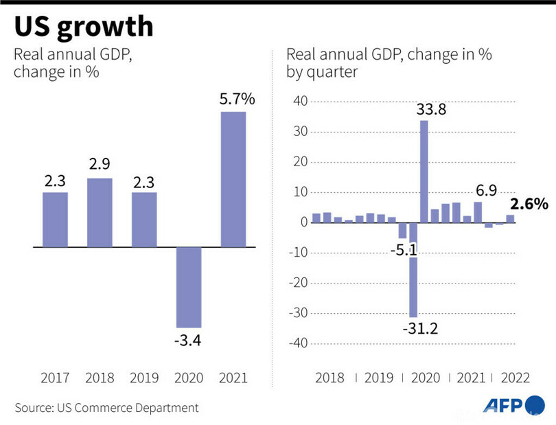 【10月28日 AFP】米商務省が27日に公表した7~9月期の実質国内総生産(GDP)は、年率換算で前期比2.6%増と、3四半期ぶりのプラス成長となった。中間選挙を控えるジョー・バイデン(Joe Biden)大統領には朗報となった。