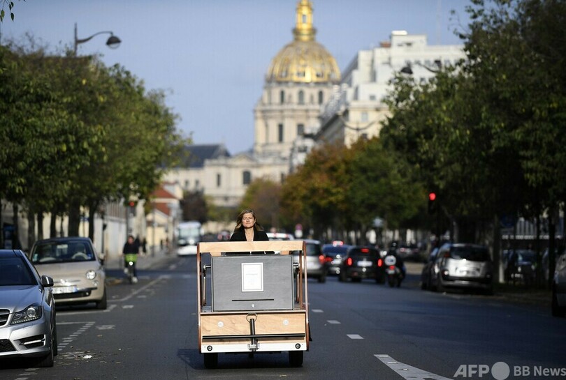 【11月7日 AFP】フランス・パリの葬儀会社「ル・シエル・エ・ラ・テール(Le Ciel et la Terre、空と大地の意)」が発表した霊きゅう自転車「コルビシクレット」。この自転車を開発した同社社長のイサベル・プリュムロー氏は、人々の歩調に合わせてひつぎを運ぶ「葬儀の新しいかたち」を提案したいと語っている。(c)AFP