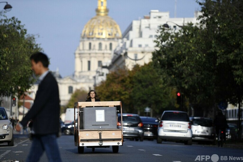 【11月7日 AFP】フランス・パリの葬儀会社「ル・シエル・エ・ラ・テール(Le Ciel et la Terre、空と大地の意)」が発表した霊きゅう自転車「コルビシクレット」。この自転車を開発した同社社長のイサベル・プリュムロー氏は、人々の歩調に合わせてひつぎを運ぶ「葬儀の新しいかたち」を提案したいと語っている。(c)AFP