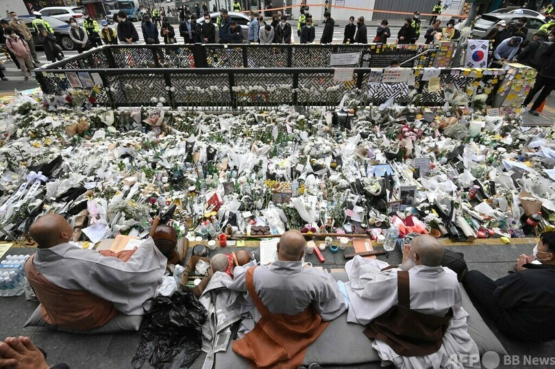 ニュース 社会 ソウル雑踏事故、献花相次ぐ 僧侶が追悼 2022年11月3日 19:21 発信地:ソウル/韓国 [ 韓国 韓国・北朝鮮 ] このニュースをシェア ‹ › ❮ 1/11 ❯ ハロウィーンに雑踏事故が起きた韓国ソウルの繁華街・梨泰院の地下鉄駅横の献花スペースで、犠牲者を追悼する僧侶(2022年11月3日撮影)。(c)Jung Yeon-je / AFP 画像作成中 ! 【11月3日 AFP】ハロウィーンに雑踏事故が起きた韓国ソウルの繁華街・梨泰院(Itaewon)で3日、現場近くの地下鉄駅脇に設けられた献花スペースに花を手向ける人や、祈りをささげる僧侶の姿が見られた。(c)AFP 社会 一覧へ> メディア・報道関係・法人の方向け 写真・動画 購入のお問合せ>