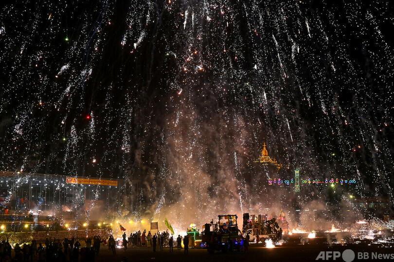 【11月19日 AFP】ミャンマー中部マンダレー(Mandalay)のピンウールウィン(Pyin Oo Lwin)で行われたタザウンダイン祭り(Tazaungdaing Lighting Festival)で、空から降ってくる火の粉から身を守ろうとする人たち。