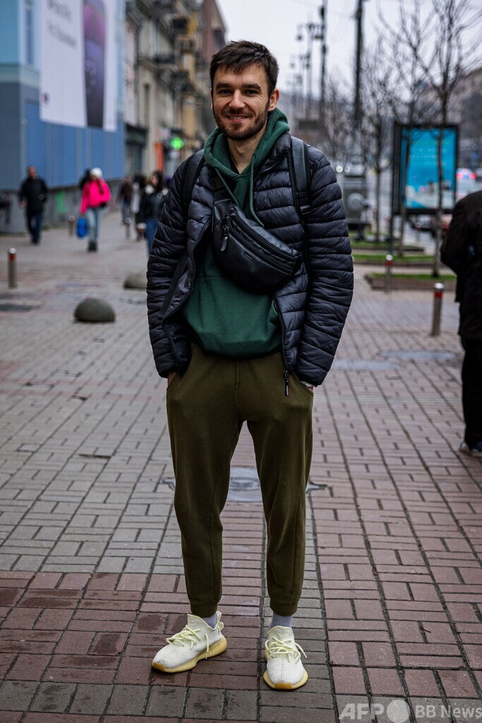 同氏は侵攻初日から、上腕の筋肉があらわになるオリーブ色のTシャツに同色系のカーゴパンツを合わせ、スニーカーを着用している。寒い日には、これにカーキのフリースの上着を羽織る。