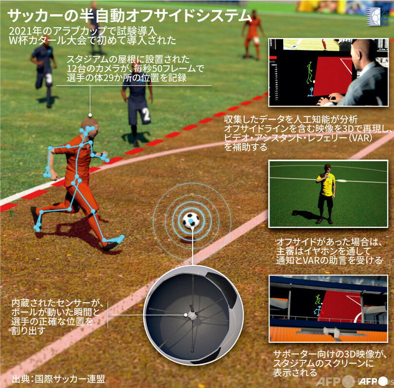 スポーツ サッカー 図解 カタールW杯 【図解】サッカーの半自動オフサイドシステム 2022年11月21日 16:55 発信地:カタール このニュースをシェア サッカーW杯カタール大会で初めて導入された「半自動オフサイドシステム」の仕組みを解説した図解(2022年11月21日作成)。(c)STEPHANE KOGUC, VALENTIN RAKOVSKY / AFP 【11月21日 AFP】サッカーW杯カタール大会(2022 World Cup)で初めて導入された「半自動オフサイドシステム」の仕組みを図解でまとめた。(c)AFP 特集:サッカーW杯カタール大会 中東初開催となるサッカーW杯カタール大会。 サッカー 一覧へ> メディア・報道関係・法人の方向け 写真・動画 購入のお問合せ>