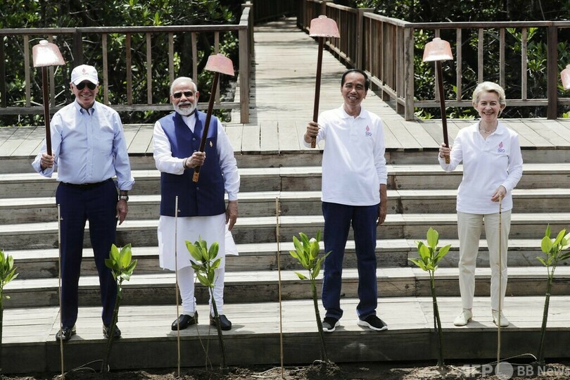 【11月16日 AFP】インドネシア・バリ(Bali)島のマングローブ林で16日、20か国・地域首脳会議(G20サミット)関連のイベントで、各国首脳らによる植樹が行われた。インドネシアのジョコ・ウィドド(Joko Widodo)大統領のほか、米国のジョー・バイデン(Joe Biden)大統領、インドのナレンドラ・モディ(Narendra Modi)首相、オーストラリアのアンソニー・アルバニージー(Anthony Albanese)首相らが参加した。(c)AFP