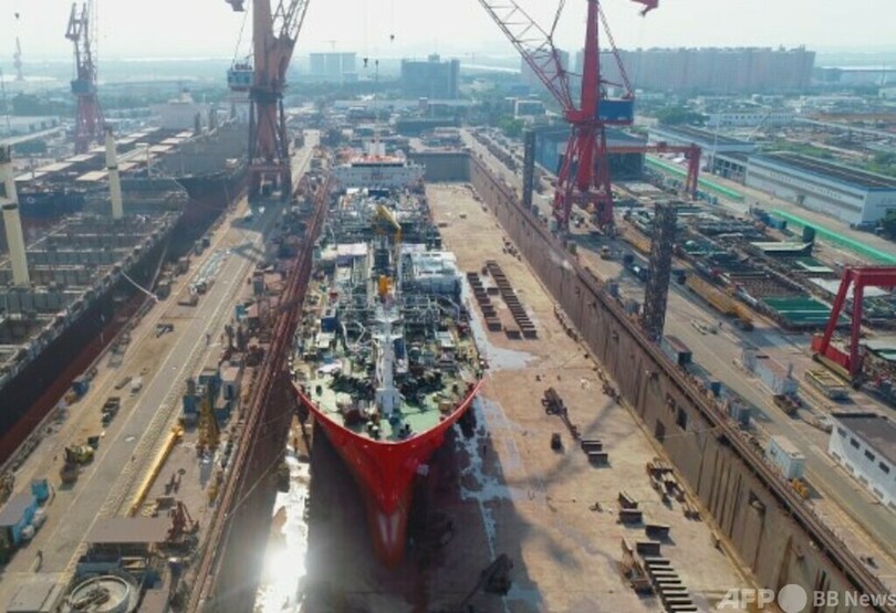 船間充填は、従来の充填方式に比べ、荷役と燃料充填の同時作業を実現し、船舶の寄港時間を短縮し、港湾運営の効率を大幅に高めることができるということです。(c)CGTN Japanese/AFPBB News