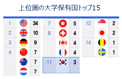 11位の韓国は、3校が上位100位圏に名を連ねた。ソウル大学が56位、延世大学が78位、KAISTが91位だった。日本は世界順位39位の東京大学など2つの大学を保有し、シンガポールとともに12位タイに入った。