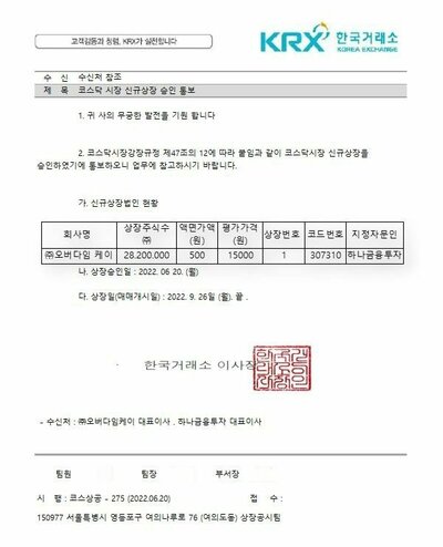 公文書にはオーバーダイムケイの上場時期と主管社など具体的な情報が記されている。オーバーダイムケイが今月26日に上場し、発行株式数は2820万株、1株当り価格は1万5000ウォンという内容だ。主管社はハナ金融投資と書かれていた。また、取引所の職印とともにコード番号まで書かれていた。