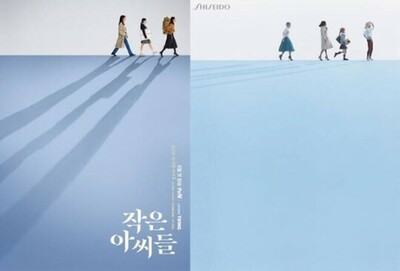 若草物語のポスターでは、3姉妹の「オ・インジュ」(キム・ゴウン)と「インギョン」(ナム・ジヒョン)、「インヘ」(パク・ジフ)が青い水平線の上を歩き、3姉妹の後ろに影が伸びている。一方、資生堂が2016年に出した展示ポスターでも、人が水平線上をどこかに向かって歩いており、色使いも似ていた。