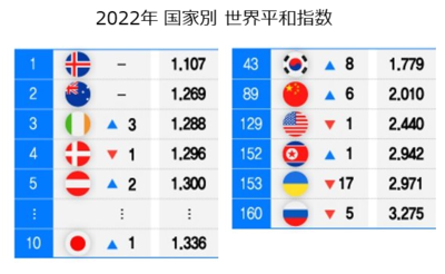 【08月14日 KOREA WAVE】豪州の国際シンクタンクの経済平和研究所(IEP)が12日、世界163カ国の「2022世界平和指数」を集計・発表した。