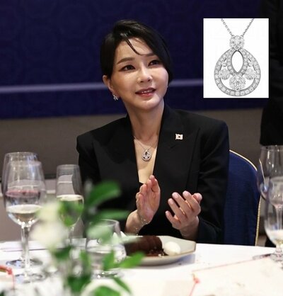 大統領室が先月29日公開した写真には、スペイン・マドリードで開かれた在スペイン同胞招請晩餐懇談会で、キム氏がフランスの高級ブランド「ヴァン クリーフ&アーペル(Van Cleef & Arpels)」のネックレスを着用し、関心を集めた。
