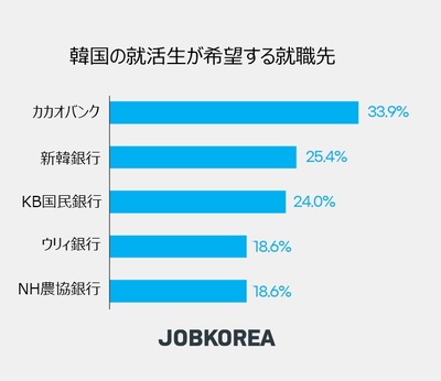 「最も就職したい金融会社」はカカオバンクが33.9%で1位だった。同社は昨年の調査でも1位にランクされている。これに新韓銀行25.4%、KB国民銀行24.0%、ウリィ銀行18.6%、NH農協銀行18.6%が続いた。