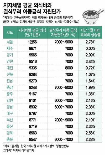 行政安全省の発表(12日)によると、欠食の恐れがある18歳未満の児童に地方自治体が支援する外食補助金は、市道別に1食当たり6000ウォンから9000ウォンだ。統計庁と韓国消費者院によると、先月の全国平均の外食費は1食9159ウォンで、補助金額より高い。