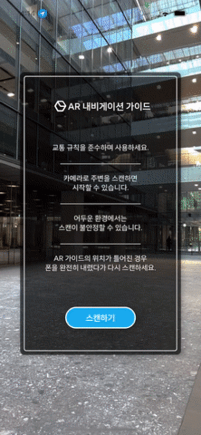 スマートフォンのカメラで建物の内部をスキャンする。韓国ネット大手ネイバーが開発したブレーンレスロボット「AMBIDEX」が登場し、フロア別のオフィスを案内する。「ラボ研究所」と検索すると、カメラ画面に「後ろを向いて25メートル移動せよ」という表示がAR(拡張現実)に表示される。移動方向だけでなく、到着地まで距離がどのくらい残っているのかもリアルタイムで表示される。延べ面積5万坪のネイバー第2社屋から目的地まで1分30秒で到着した。