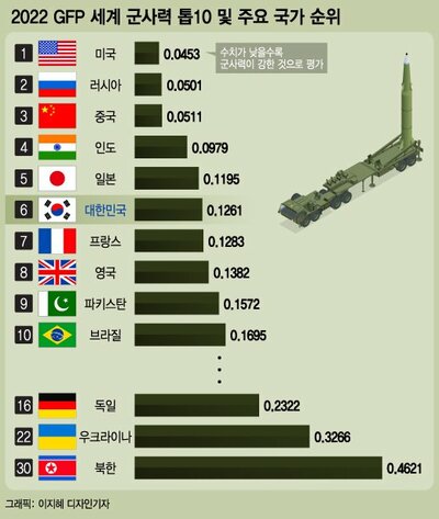 核兵器を除いた通常戦力を中心に韓国は6位に入った。世界最大の軍事大国・米国を先頭にロシア、中国、インド、日本が2~5位を占めた。ロシア(世界2位)が侵攻するウクライナは22位、韓国と対峙している北朝鮮は30位だった。