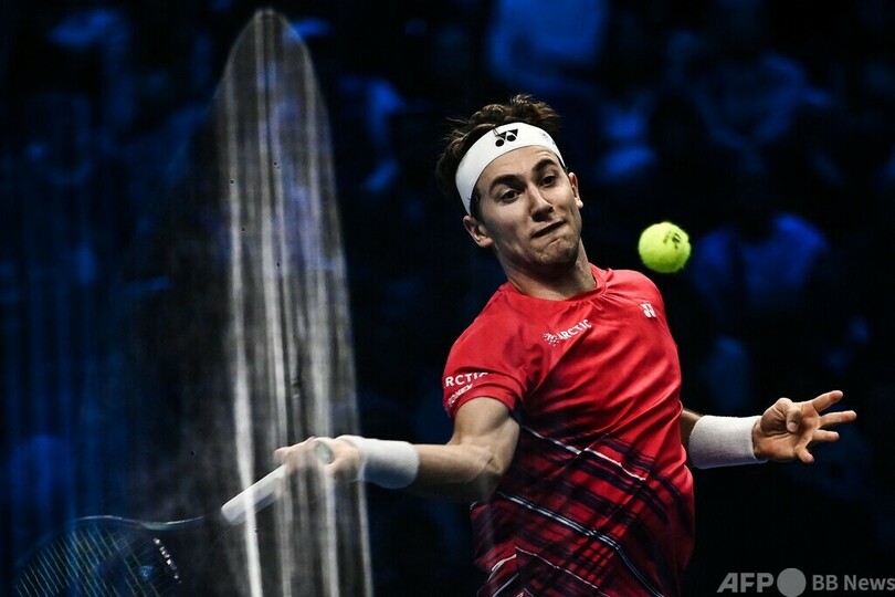 この日行われたシーズン最終戦のATPファイナルズ(ATP Finals 2022)のシングルスラウンドロビンで、大会第1シードのナダルは7-5、7-5で第3シードのキャスパー・ルード(Casper Ruud、ノルウェー)に勝利。すでに2連敗して大会の敗退が決まっていた中で、慰めの1勝を手にした。(c)AFP