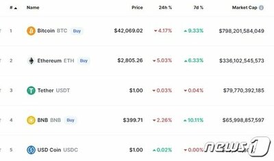 ビットコインは4日午前7時現在、グローバルコイン市況中継サイトのコインマーケットキャップで24時間前より4.17%急落した4万2000ドルを記録し、かろうじて4万2000ドル台を維持している。