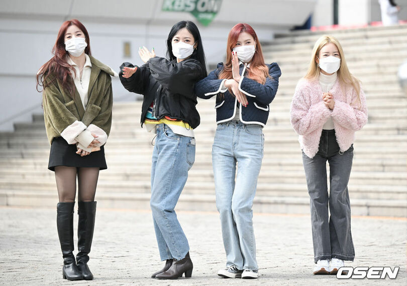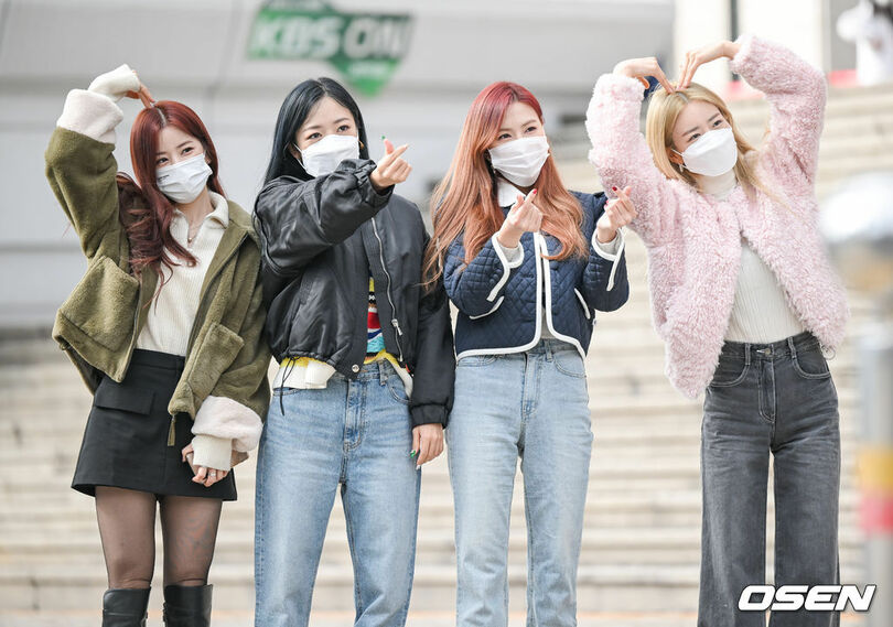 【02月15日 KOREA WAVE】Apinkのパク・チョロン、キム・ナムジュ、オ・ハヨン、 ユン・ボミが15日午後、KBSクールFM「チョン・ウンジの歌謡広場」出演のため、ソウル市・汝矣島(ヨイド)のKBS本館に到着し、ポーズを取っている。