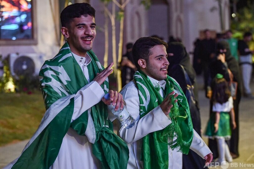 首都リヤドでは、試合終了のホイッスルが吹かれるとファンが街中で喜びを爆発させ、即興のダンス集団を結成し、走る車の窓から剣の描かれた国旗を振った。(c)AFP
