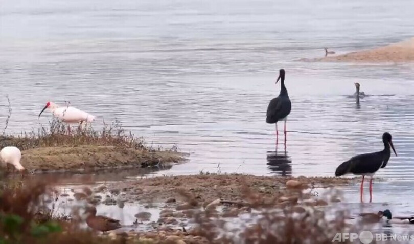 トキ保護区の職員によりますと、ここ数年、陝西省南部に位置する山脈「秦嶺」南麓の生態環境が持続的に改善するにつれて、漢江湿地は魚類資源が豊かになり、ナベコウの移動途中における栄養補給場所になっています。保護区ではこれまで、ナベコウの姿は断片的に観察されていましたが、今年は十羽以上が同時に観察され、トキと一緒に餌探しをする様子も撮影されました。保護区の職員は現在、ナベコウの観察と保護に力を入れています。(c)CGTN Japanese/AFPBB News