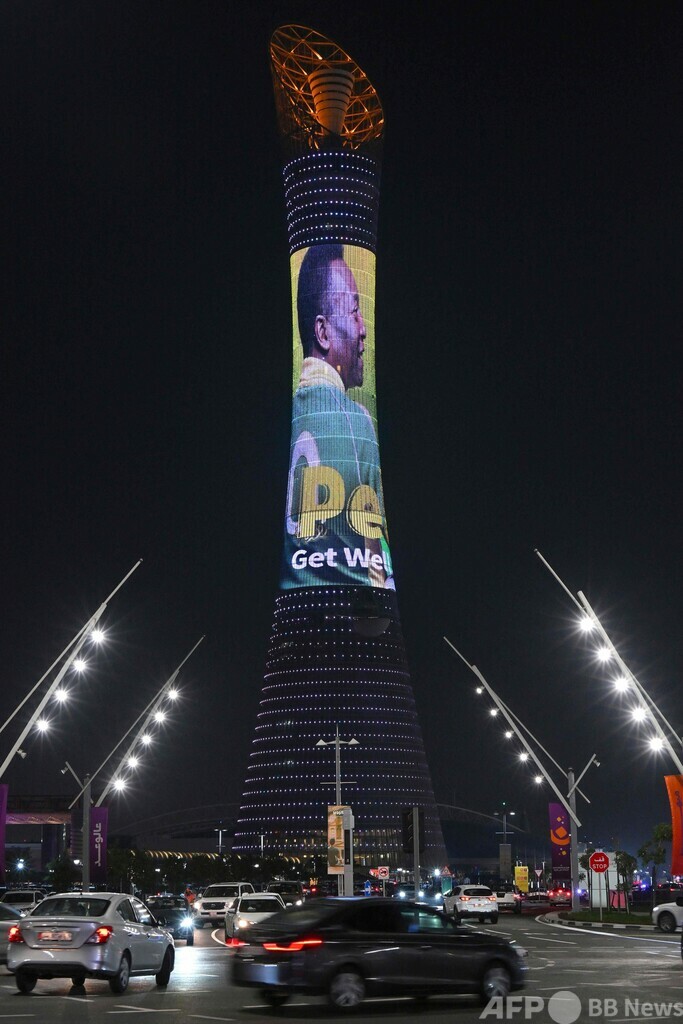 【12月4日 AFP】サッカーW杯カタール大会(2022 World Cup)が開催されている同国では3日、現在入院中の元ブラジル代表の伝説的選手ペレ(Pele)氏への連帯を示すために、建物が「早期回復を願う」というメッセージでライトアップされた。