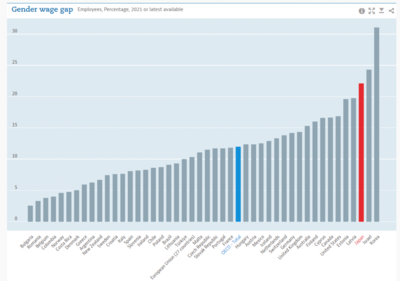 OECDが4日公開した最近の「性別間賃金格差(Gender wage gap)」によると、2021年時点で韓国の性別賃金格差は31.1%だった。女性は男性の68.9%程度の賃金で働いていたことになる。
