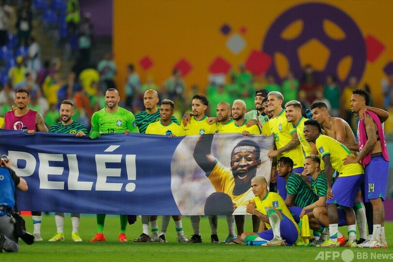 5日にW杯カタール大会(2022 World Cup)の決勝トーナメント1回戦の韓国戦に4-1で勝利したブラジル代表チームは試合後、1970年のW杯メキシコ大会(1970 World Cup)での優勝を喜ぶ写真とともに「ペレ!」と書かれた横断幕を掲げていた。この試合を前にペレ氏は、インスタグラム(Instagram)のアカウントにチームに対するメッセージを投稿し、病院から応援すると語っていた。(c)AFP