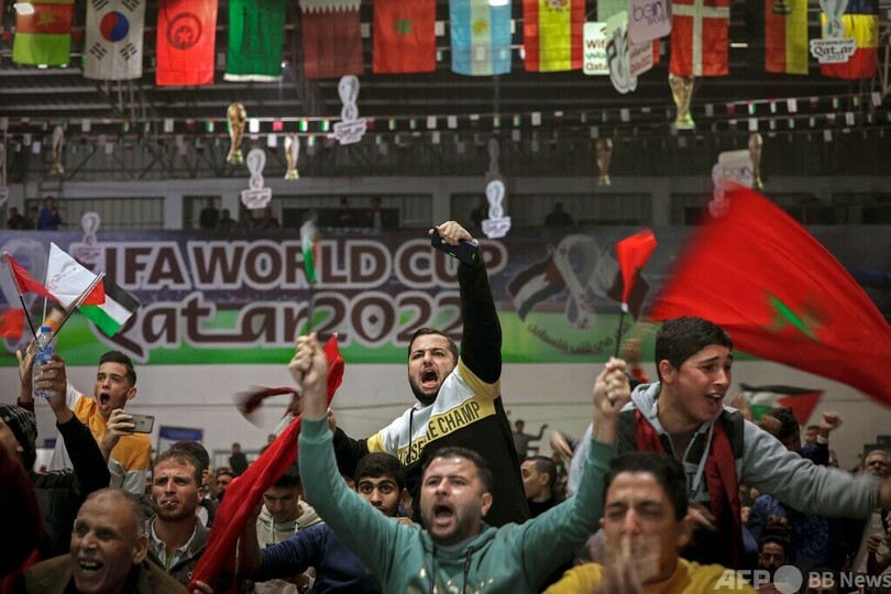 スペイン撃破のモロッコ、パレスチナ旗で喜ぶ カタールW杯