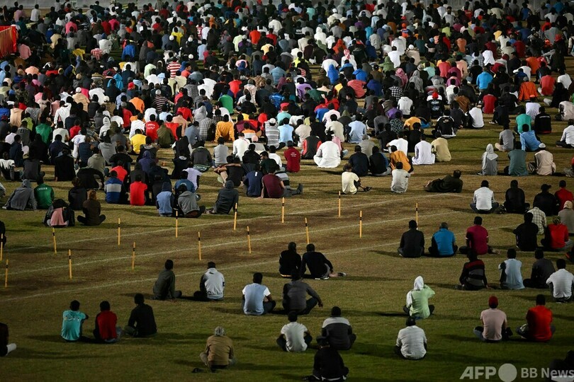 同スタジアムは、市内のきらびやかなショッピングモールやレストランから離れた場所にある。移民労働者たちは近くの寮で生活しており、同スタジアムには連日大勢が集まっている。(c)AFP