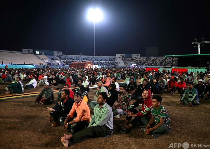 同スタジアムは、市内のきらびやかなショッピングモールやレストランから離れた場所にある。移民労働者たちは近くの寮で生活しており、同スタジアムには連日大勢が集まっている。(c)AFP