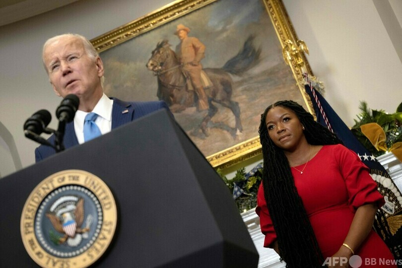 バイデン氏と共に会見したグライナー選手の妻シェレル(Cherelle Griner)さんは、同選手解放の知らせを受けて「感極まっている」と表明した。(c)AFP