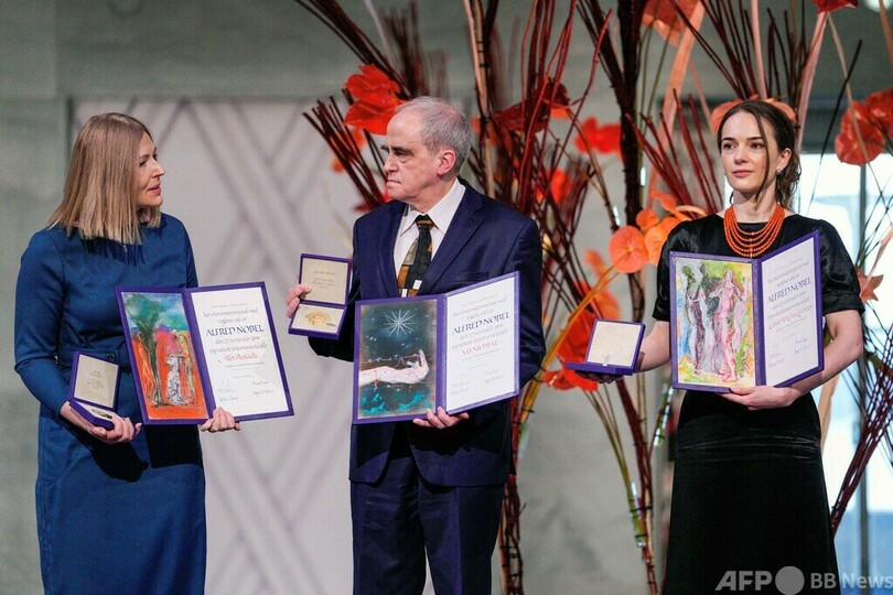 【12月11日 AFP】2022年ノーベル平和賞(Nobel Peace Prize)の授賞式が10日、ノルウェー・オスロの市庁舎で行われた。共同受賞したウクライナの人権団体「市民自由センター(CCL)」とロシアの人権団体「メモリアル(Memorial)」の代表、ベラルーシの人権活動家アレシ・ビャリャツキ(Ales Bialiatski)氏(妻が代理出席)は、ロシアのウラジーミル・プーチン(Vladimir Putin)大統領の「常軌を逸した犯罪的な」ウクライナ侵攻に対して最大限の抵抗を継続するよう世界に訴えた。