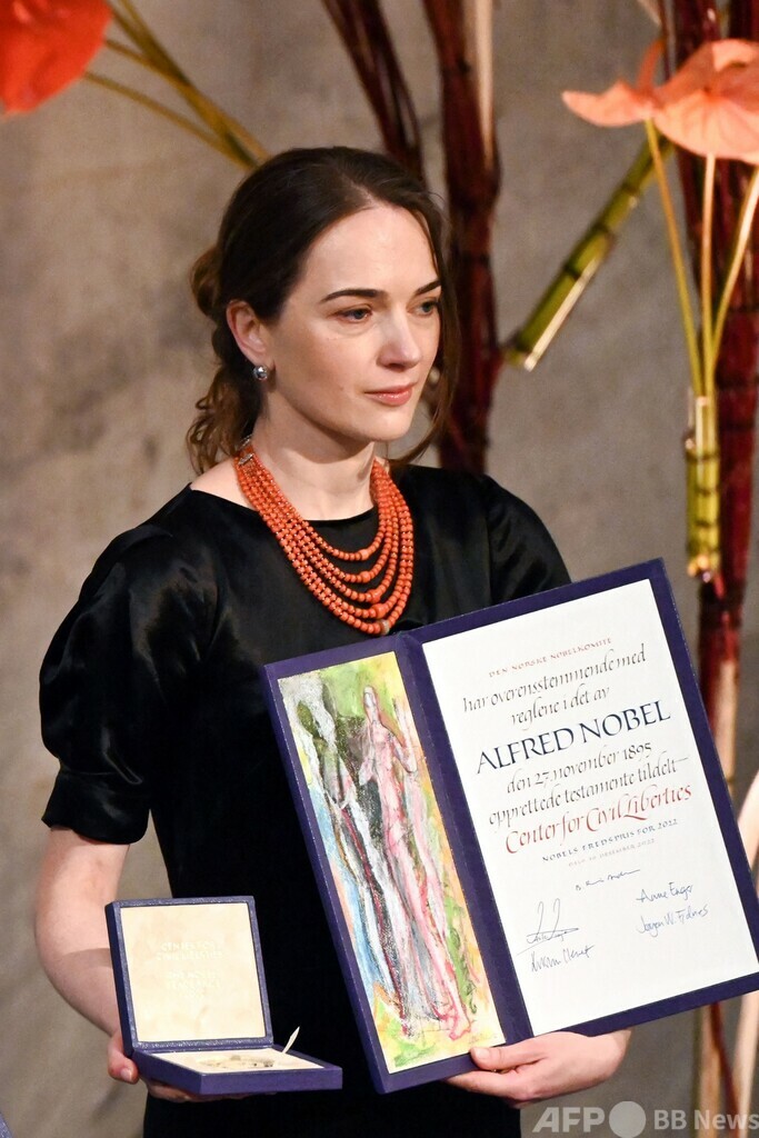【12月11日 AFP】2022年ノーベル平和賞(Nobel Peace Prize)の授賞式が10日、ノルウェー・オスロの市庁舎で行われた。共同受賞したウクライナの人権団体「市民自由センター(CCL)」とロシアの人権団体「メモリアル(Memorial)」の代表、ベラルーシの人権活動家アレシ・ビャリャツキ(Ales Bialiatski)氏(妻が代理出席)は、ロシアのウラジーミル・プーチン(Vladimir Putin)大統領の「常軌を逸した犯罪的な」ウクライナ侵攻に対して最大限の抵抗を継続するよう世界に訴えた。
