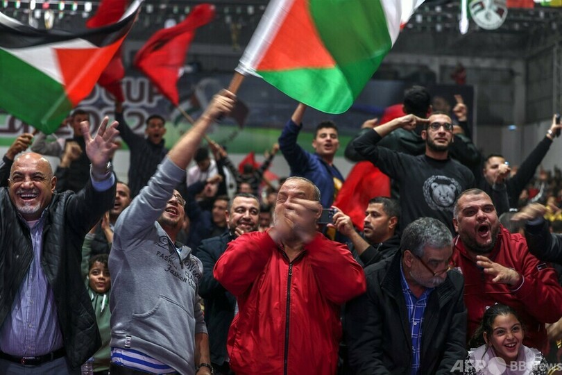 パレスチナ自治区ヨルダン川西岸(West Bank)のヘブロン(Hebron)やガザ地区(Gaza)のガザ市でも、大勢が固唾をのんで試合を見守った。終了を告げるホイッスルが鳴ると、通りに繰り出して勝利を祝った。(c)AFP