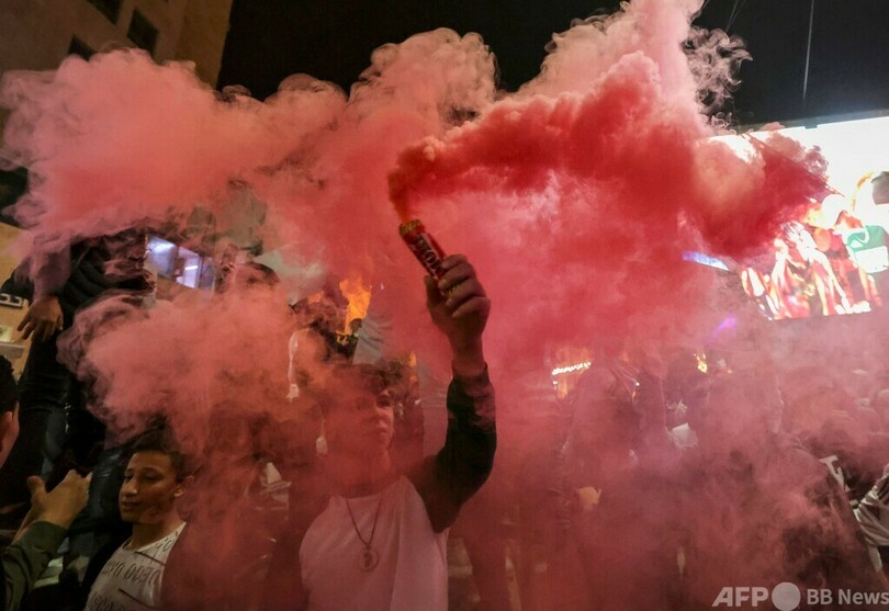 パレスチナ自治区ヨルダン川西岸(West Bank)のヘブロン(Hebron)やガザ地区(Gaza)のガザ市でも、大勢が固唾をのんで試合を見守った。終了を告げるホイッスルが鳴ると、通りに繰り出して勝利を祝った。(c)AFP