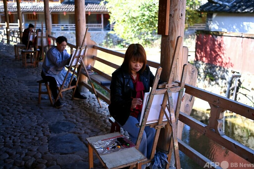 低身長症のため身長が1.2メートルに満たない沈明輝(Shen Minghui)さんは以前、路上で風船を売って生計を立てていた。2015年から油絵を学び始め、今はアトリエを兼ねて民宿を経営。壁に自分の作品を飾り、インターネットを通じて販売している。陳孝堅(Chen Xiaojian)さんと謝秀鳳(Xie Xiufeng)さんは夫婦で絵を描き始め、自宅を民宿に変えた。自然が美しい村の中、あちこちで村民たちがキャンバスに向かう光景が観光客たちの目を楽しませている。(c)CNS/JCM/AFPBB News