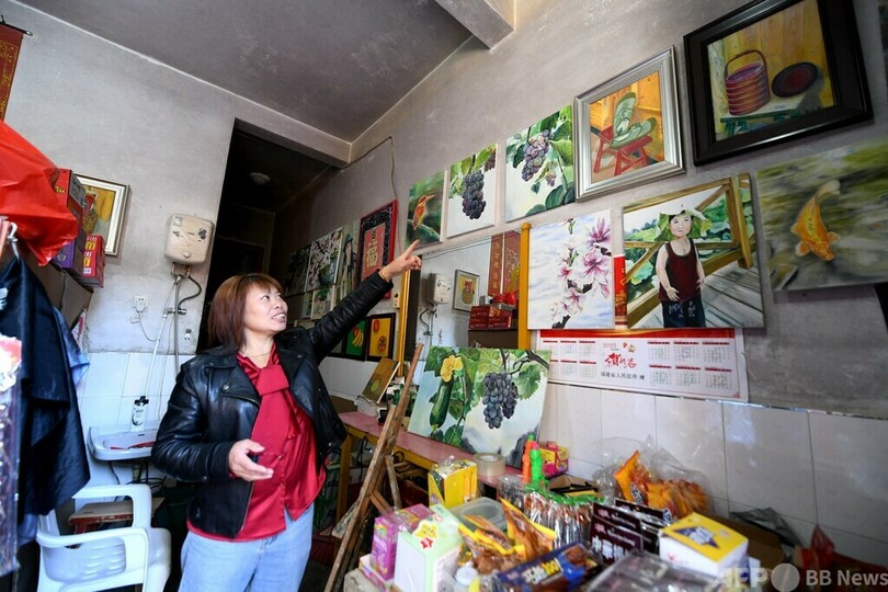低身長症のため身長が1.2メートルに満たない沈明輝(Shen Minghui)さんは以前、路上で風船を売って生計を立てていた。2015年から油絵を学び始め、今はアトリエを兼ねて民宿を経営。壁に自分の作品を飾り、インターネットを通じて販売している。陳孝堅(Chen Xiaojian)さんと謝秀鳳(Xie Xiufeng)さんは夫婦で絵を描き始め、自宅を民宿に変えた。自然が美しい村の中、あちこちで村民たちがキャンバスに向かう光景が観光客たちの目を楽しませている。(c)CNS/JCM/AFPBB News
