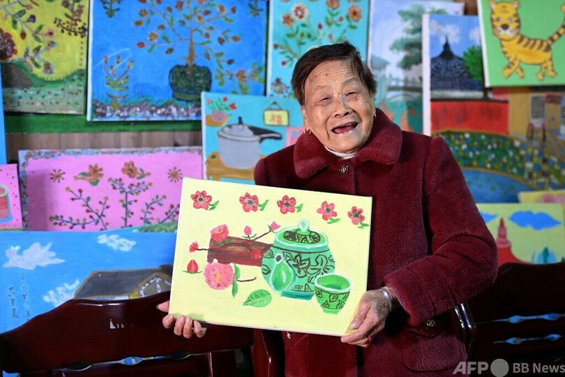 低身長症のため身長が1.2メートルに満たない沈明輝(Shen Minghui)さんは以前、路上で風船を売って生計を立てていた。2015年から油絵を学び始め、今はアトリエを兼ねて民宿を経営。壁に自分の作品を飾り、インターネットを通じて販売している。陳孝堅(Chen Xiaojian)さんと謝秀鳳(Xie Xiufeng)さんは夫婦で絵を描き始め、自宅を民宿に変えた。自然が美しい村の中、あちこちで村民たちがキャンバスに向かう光景が観光客たちの目を楽しませている。(c)CNS/JCM/AFPBB News