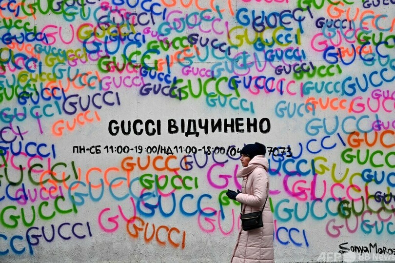 【12月13日 AFP】ウクライナの首都キーウで12日、伊高級ブランド「グッチ(Gucci)」店舗前を歩く女性の姿が見られた。砲弾の破片などで割れないようショーウインドー前に置かれた板には、「グッチ営業中」と書かれていた。(c)AFP