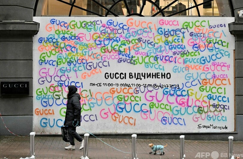 【12月13日 AFP】ウクライナの首都キーウで12日、伊高級ブランド「グッチ(Gucci)」店舗前を歩く女性の姿が見られた。砲弾の破片などで割れないようショーウインドー前に置かれた板には、「グッチ営業中」と書かれていた。(c)AFP