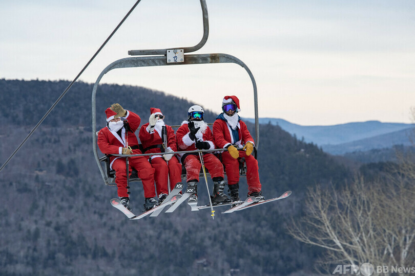 【12月24日 AFP】米メーン州ニューリー(Newry)のサンデー・リバー・リゾート(Sunday River Resort)で開かれたチャリティーイベント「サンタ・サンデー(Santa Sunday)」で、サンタクロースの衣装を着てリフトに乗るスキーヤーやスノーボーダー。(c)AFP